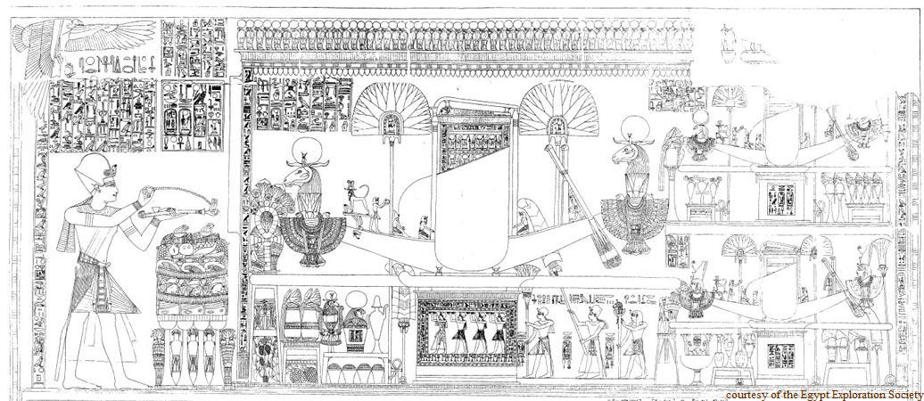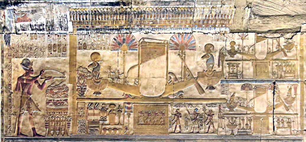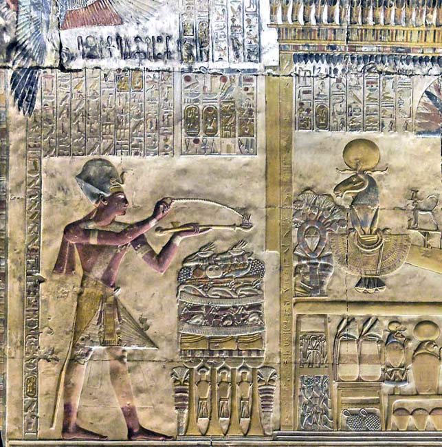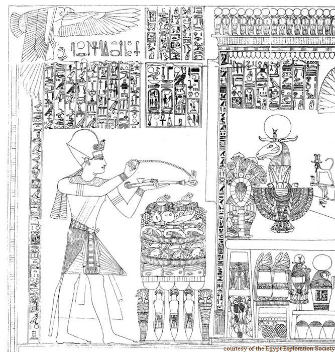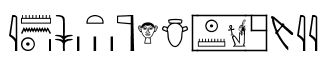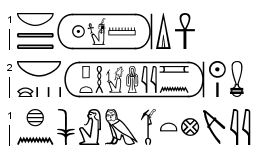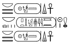 le roi de Haute et Basse Égypte, le Maître des Deux-Terres ( Men-Maât-Rê )|, le fils de Rê, issu de son flanc, qu'il aime, le Maître des couronnes ( Sethy aimé de Ptah )| doué de vie (éternellement).