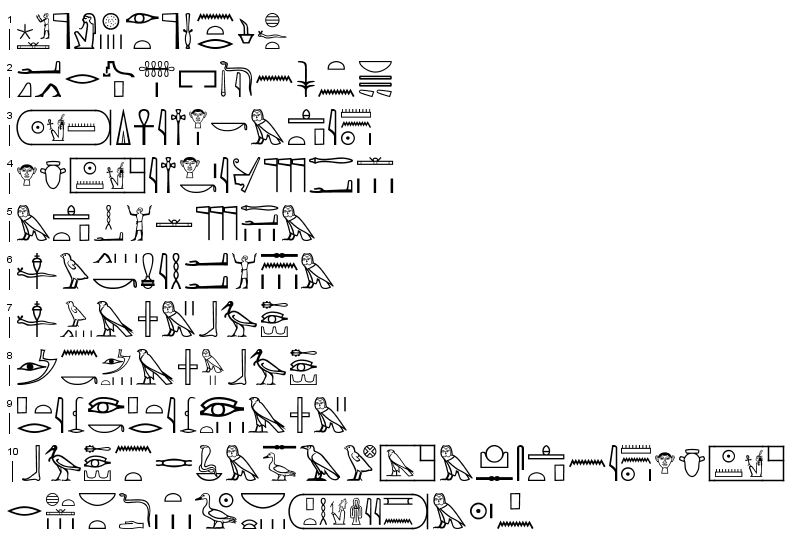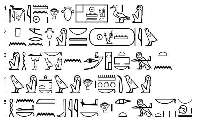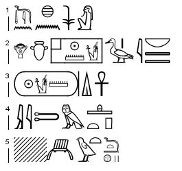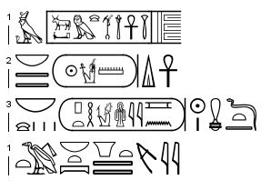Que vive l'Horus, taureau puissant couronné dans Thèbes, qui fait vivre les Deux-Terres, Les Deux-Maîtresses, Celui qui renouvelle les naissances, celui dont la force est puissante, celui qui repousse les 9 arcs, L'Horus d'or: Celui qui renouvelle les puissants dans tous les pays, le roi de Haute et Basse Égypte,